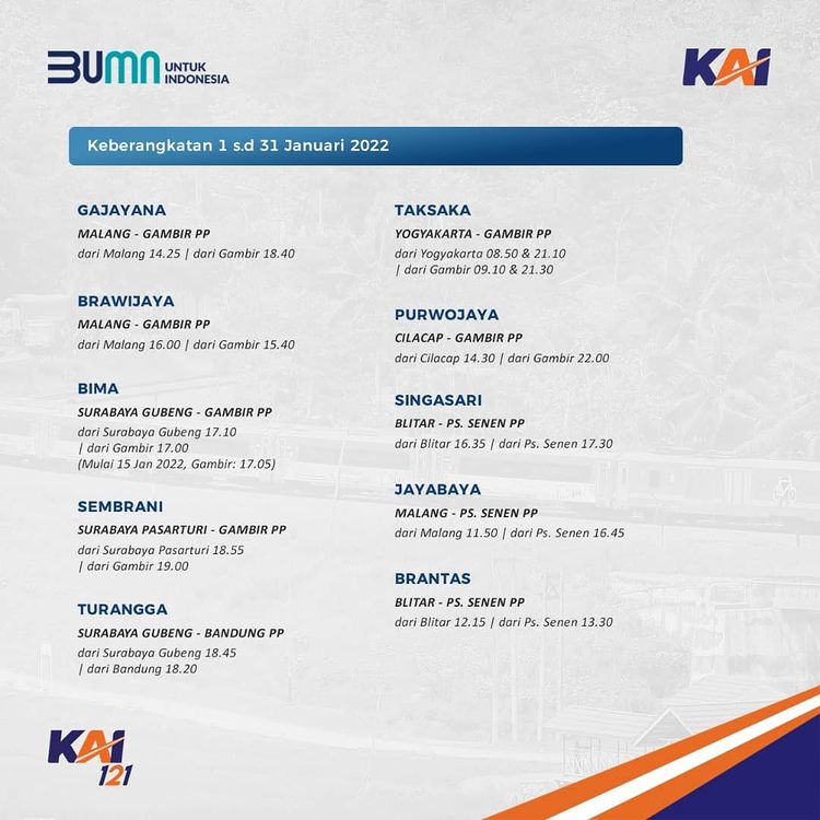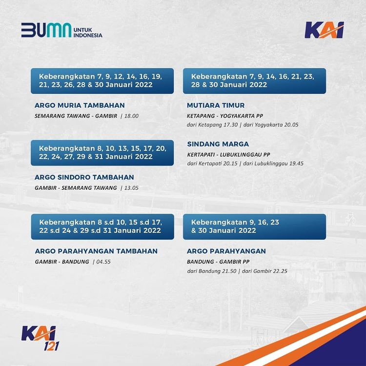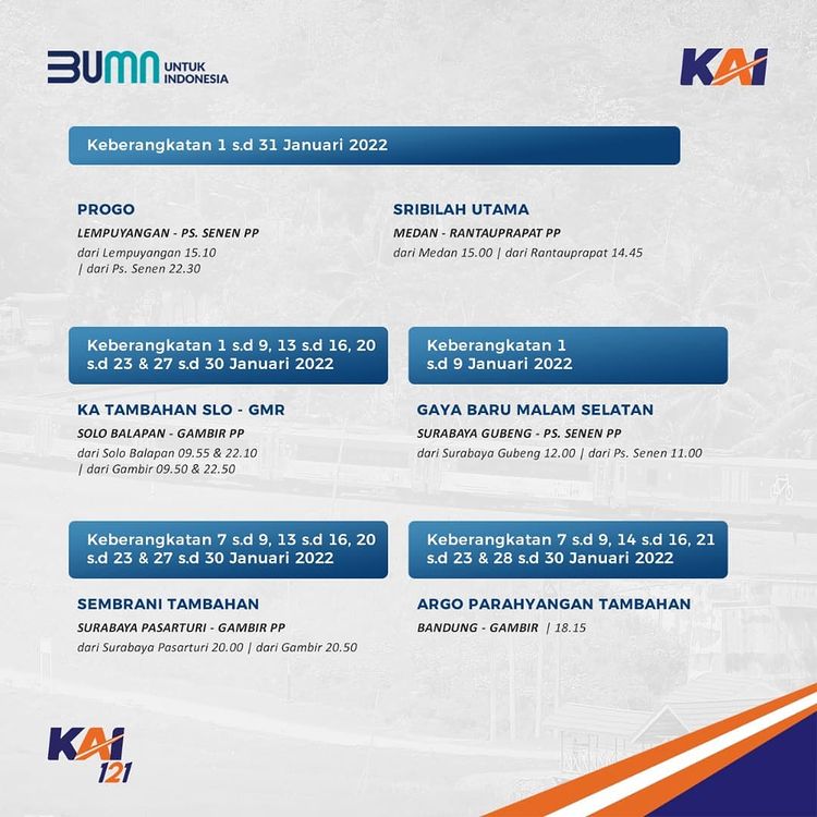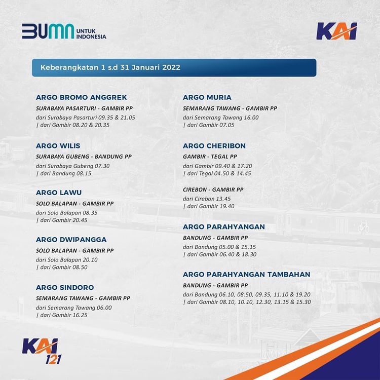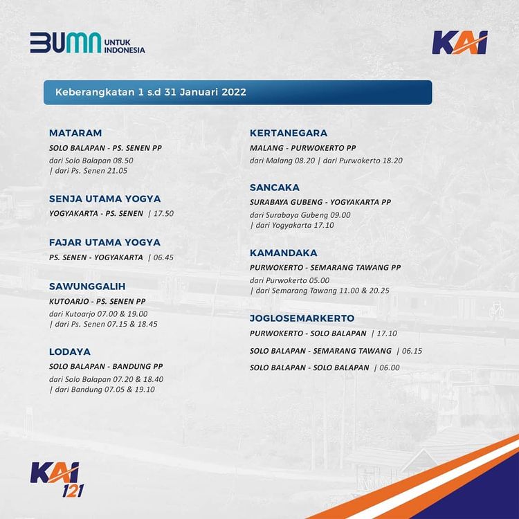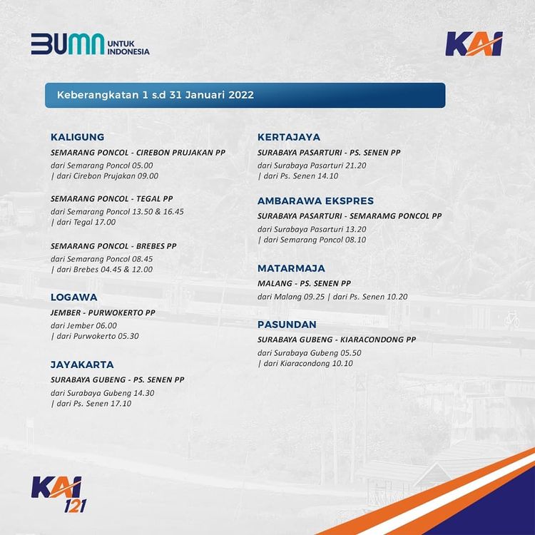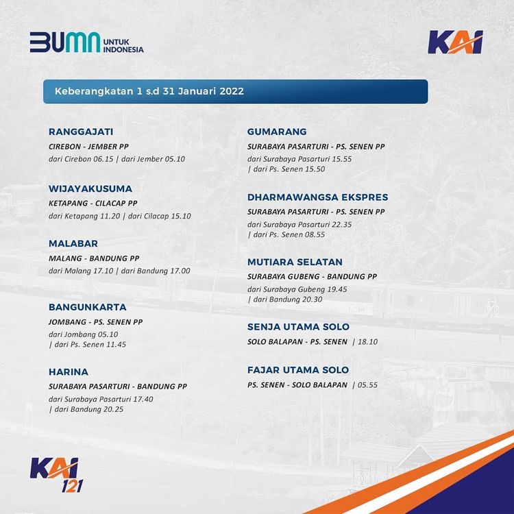 Railmin kasih tau jadwal KA yang beroperasi di bulan Januari ini ya, #SahabatKAI. Jadwal KA yang terupdate, juga bisa kalian cek melalui aplikasi KAI Access.