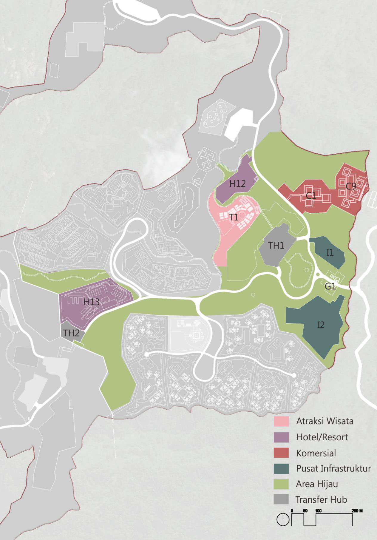 - Jalur utama direncanakan sebagai boulevard streetscape yang diarahkan kepada landmark utama kawasan