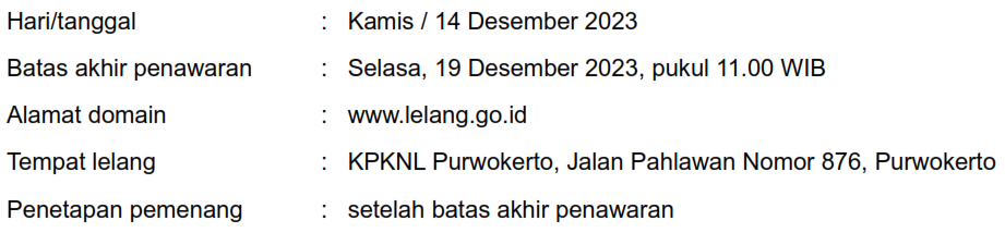 - Untuk informasi mengenai proses lelang, calon peserta dapat menghubungi KPKNL Purwokerto, JI. Pahlawan No.876, Tanjung, Kec. Purwokerto Selatan, Kabupaten Banyumas, Jawa Tengah Telp (0281) 630454.