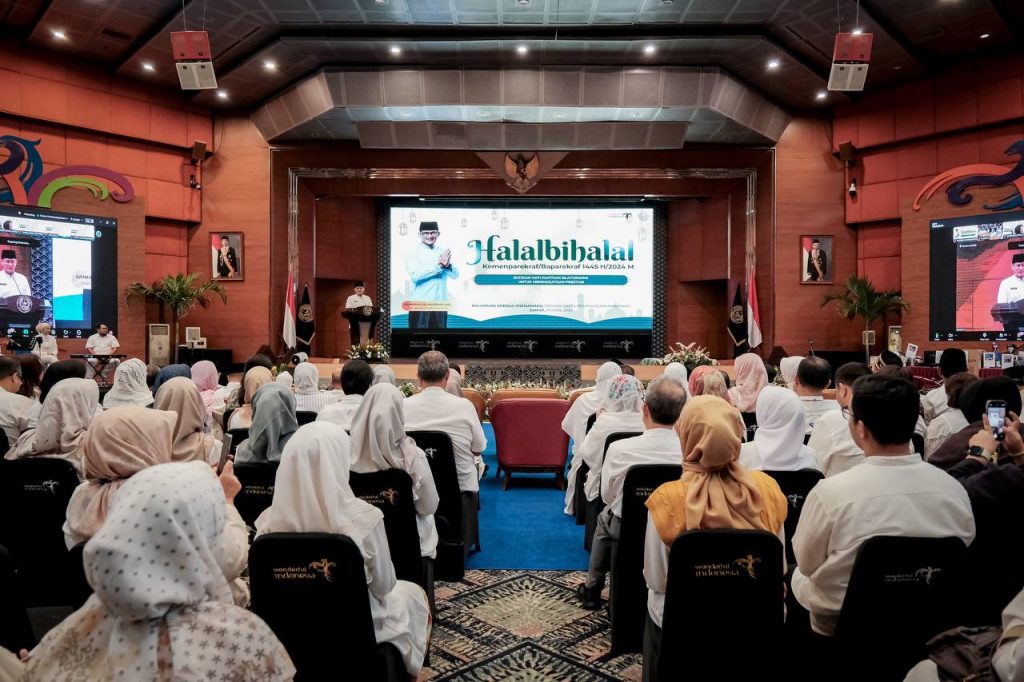 Yogyakarta, 19 April 2024 – Kementerian Pariwisata dan Ekonomi Kreatif/Badan Pariwisata dan Ekonomi Kreatif (Kemenparekraf/Baparekraf) menyelenggarakan kegiatan halalbihalal dalam rangka IdulFitri 1445 Hijriah yang dihadiri Menparekraf Sandiaga Salahuddin Uno dan Wamenparekraf Angela Tanoesoedibjo serta seluruh pejabat eselon I dan 2 juga pegawai Kemenparekraf/Baparekraf, Jumat (19/4/2024).