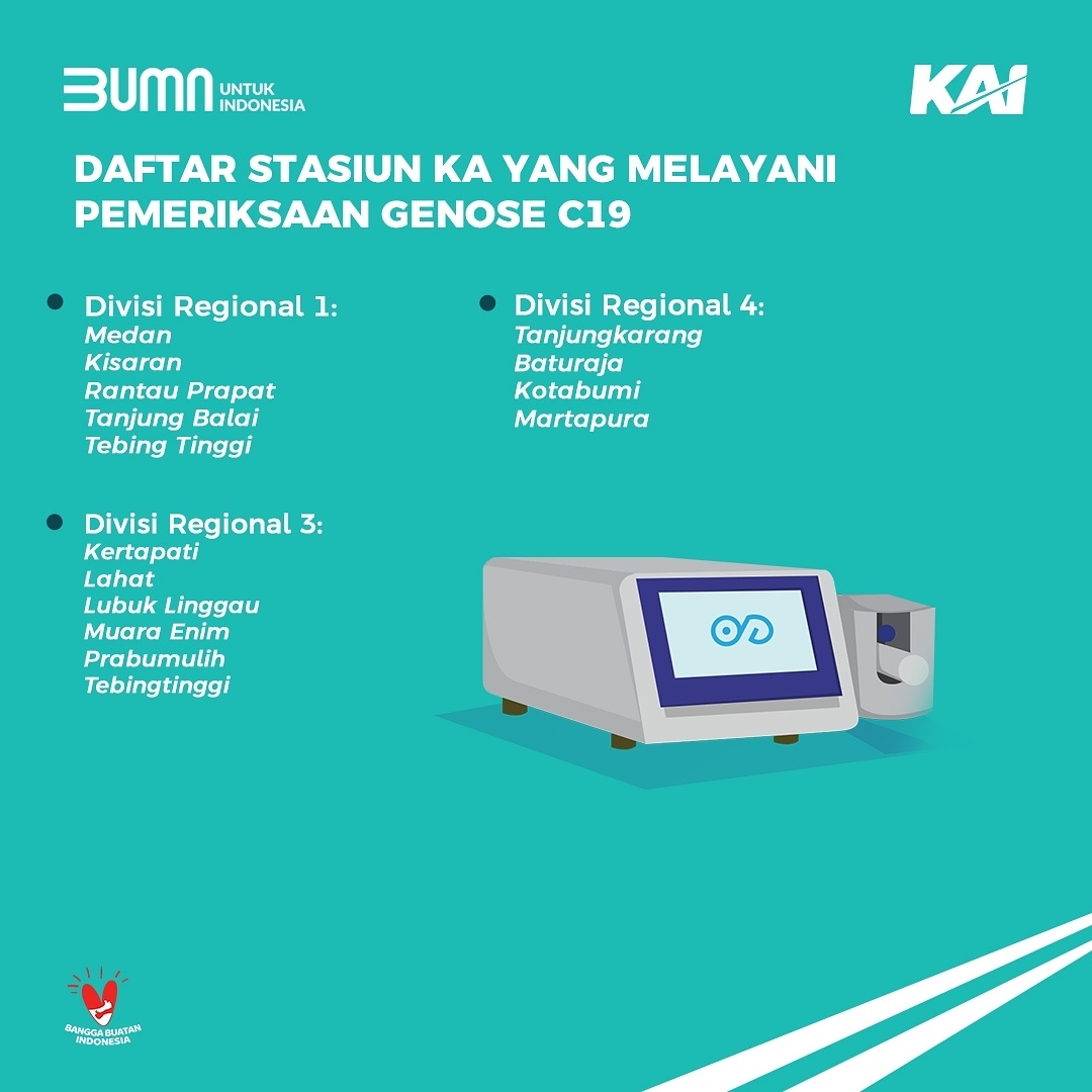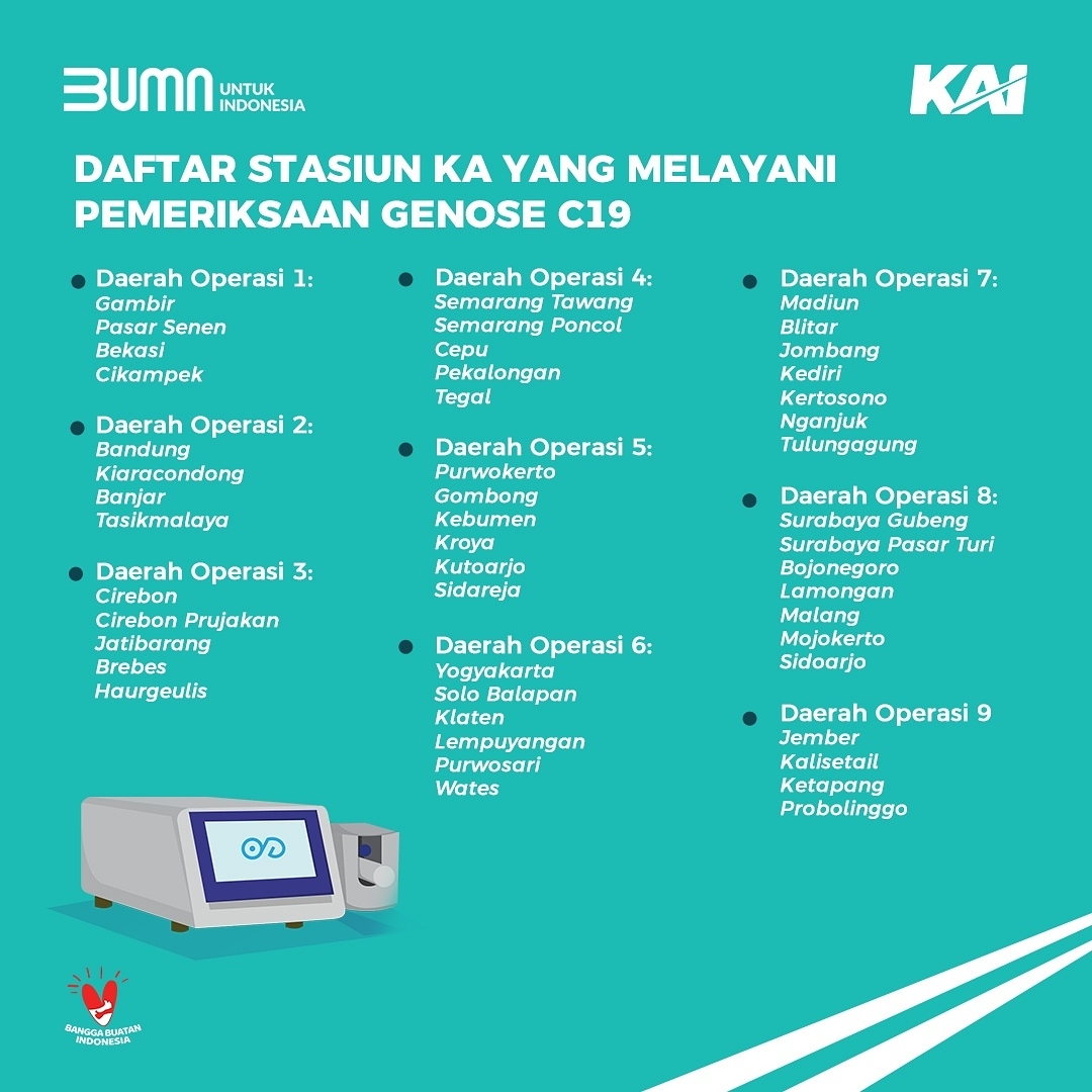 Penambahan tersebut ada di Stasiun Cikampek, Brebes, Haurgeulis, Medan, Kisaran, Rantau Prapat, Tanjung Balai dan Tebing Tinggi. Jangan lupa, masa berlaku hasil skrining COVID-19 dengan GeNose C19 adalah 1×24 jam dari pengambilan sampel. Jadi atur waktu yang cukup, agar masa berlakunya tidak melebihi jam keberangkatan kereta apinya ya.