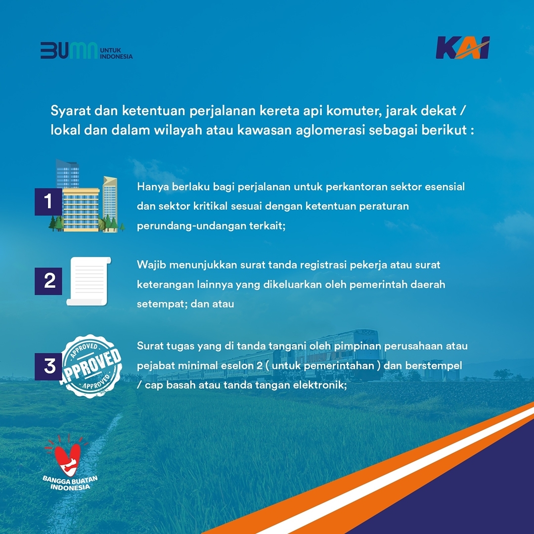 Kementerian Perhubungan melalui SE No. 50 tahun 2021 (8 Juli 2021), telah mengeluarkan regulasi yang mengatur persyaratan perjalanan orang dengan KA Komuter, Jarak Dekat/Lokal dan Aglomerasi yang diberlakukan mulai hari Senin, 12 s.d 20 Juli 2021. ⁣⁣