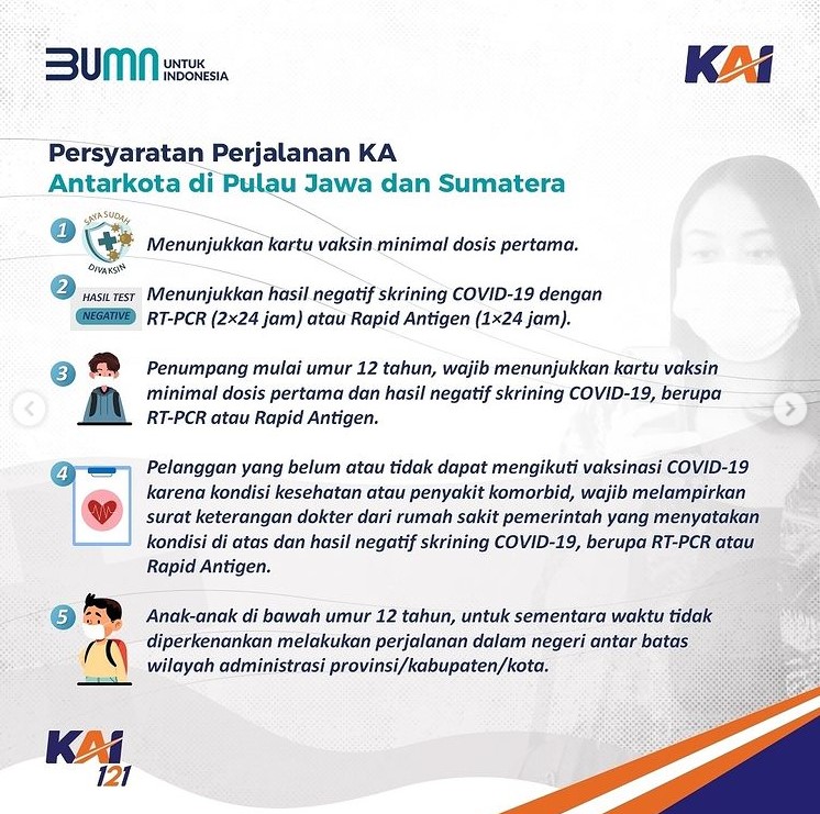 Satgas Penanganan COVID-19 kembali memperbarui persyaratan naik kereta api. Persyaratan naik KA jarak jauh dengan menunjukkan kartu vaksin COVID-19 minimal dosis pertama, serta menunjukkan hasil negatif skrining COVID-19 dengan menggunakan RT-PCR (2×24 jam) atau Rapid Antigen (1×24 jam).