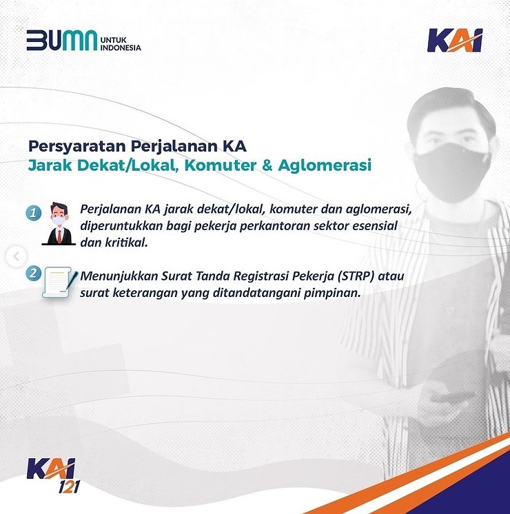 Untuk ketentuan perjalanan dengan KA jarak dekat/lokal, komuter dan aglomerasi, masih tetap sama. KA-KA tersebut hanya diperuntukkan bagi pekerja sektor kritikal dan esensial, dengan membawa Surat Tanda Registrasi Pekerja (STRP) atau surat keterangan dari pimpinan.