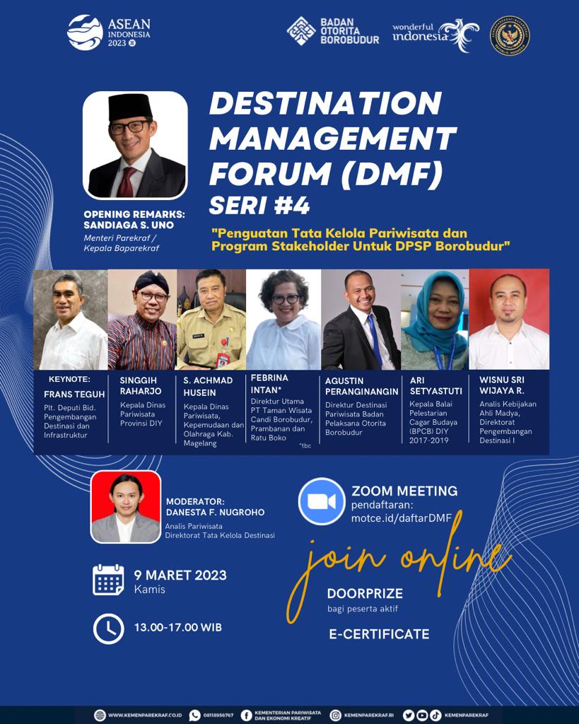 Kamis, 9 Maret 2023Halo #BOBers Yuk Ikutan! Kemenparekraf/Baparekraf melalui Deputi Bidang Pengembangan Destinasi dan Infrastruktur beserta dengan Badan Pelaksana Otorita Borobudur akan mengadakan Destination Management Forum (DMF) Seri #4. Tema DMF #4 kali ini yaitu Penguatan Tata Kelola Pariwisata dan Program Stakeholder Untuk DPSP Borobudur. Dalam rangka mengembangkan [...]