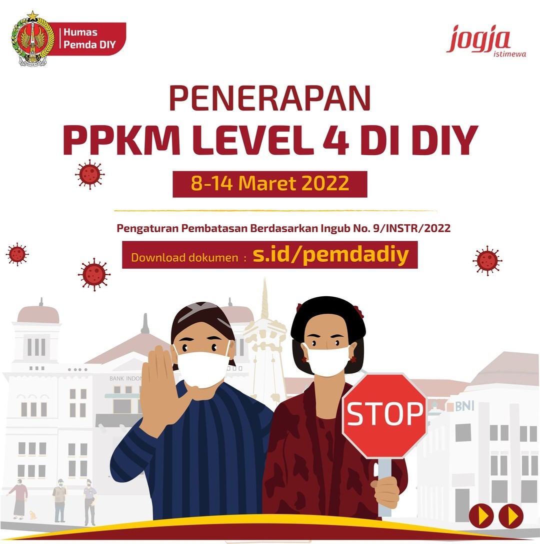 Sabtu, 12 Maret 2022Instruksi Gubernur DIY No. 9/2022 tentang Perpanjangan Pemberlakuan Pembatasan Kegiatan Masyarakat Level 4 dapat diunduh pada pranala berikut: UNDUH DISINI Sumber: @Humasjogja
