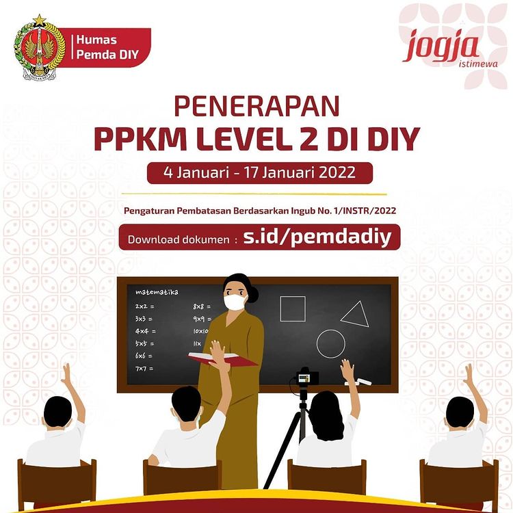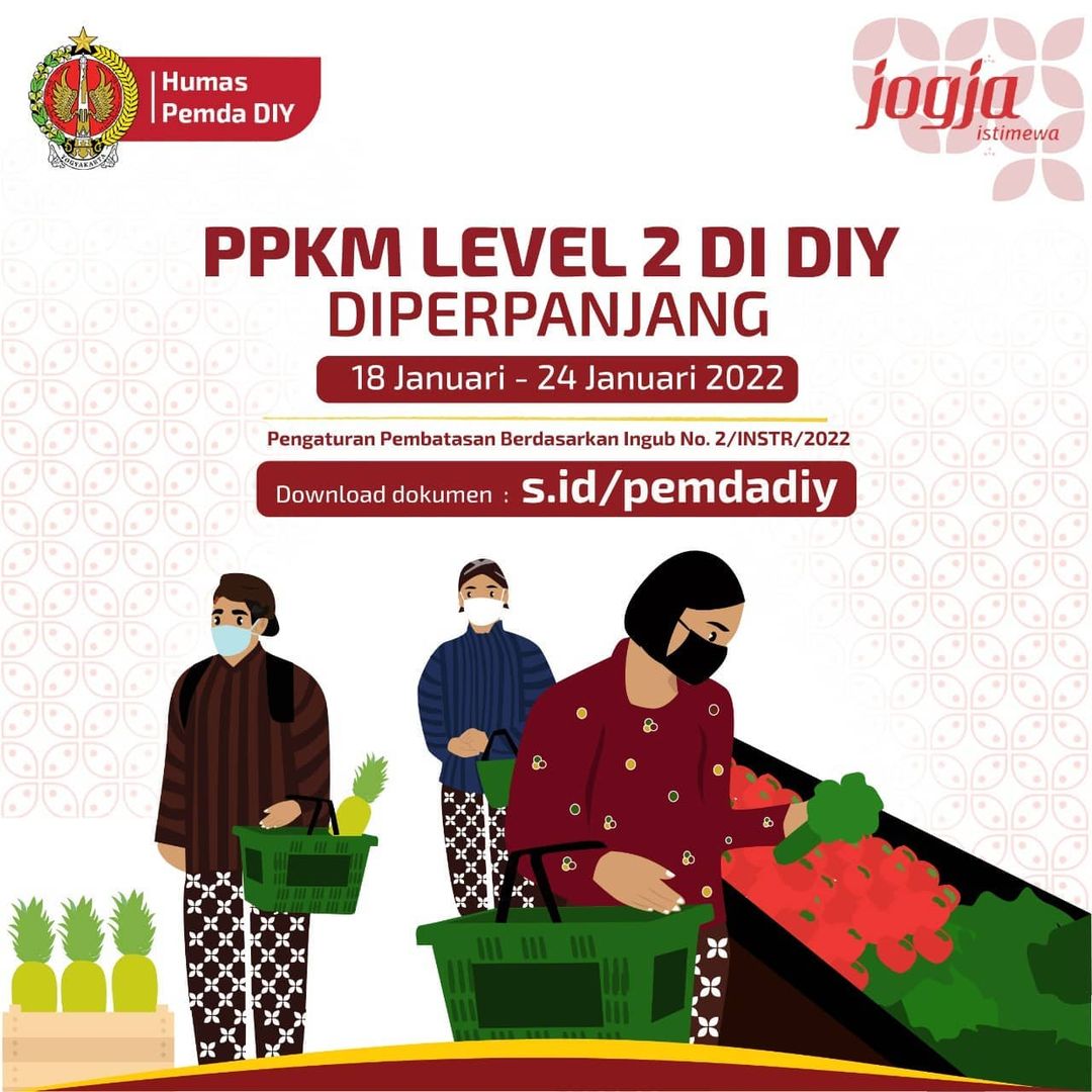 Jumat, 14 Januari 2022Instruksi Gubernur DIY No. 1/2022 tentang Perpanjangan Pemberlakuan Pembatasan Kegiatan Masyarakat Level 2 dapat diunduh pada pranala berikut: UNDUH DISINI Saat ini situasi semakin baik dan kondusif. Setelah kurang lebih dua tahun kita menghadapi virus Covid-19. Namun demikian, kita masih tetap harus eling lan [...]