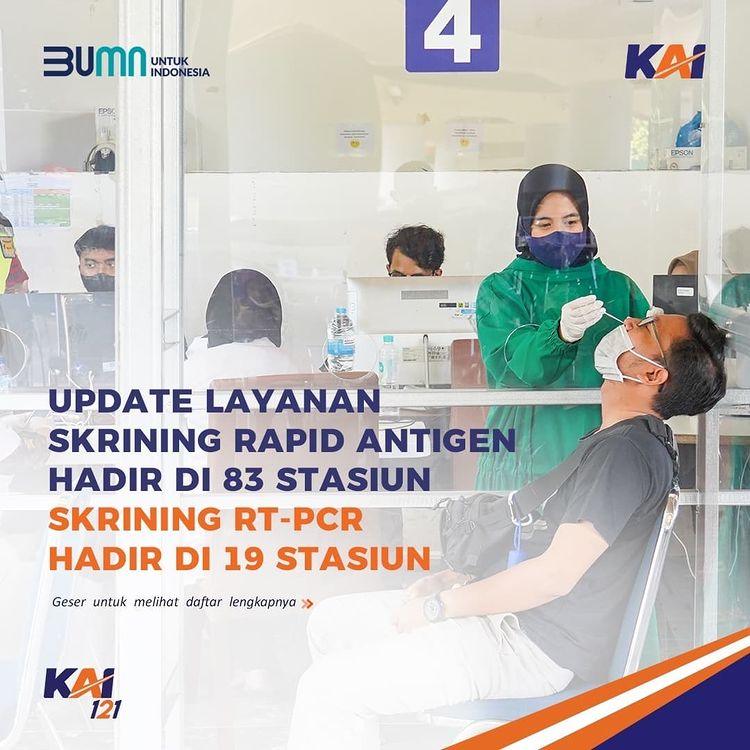 Kamis, 30 Desember 2021Dalam meningkatkan pelayanan sekaligus menjalankan regulasi yang tertuang dalam SE No. 112/2021 Kemenhub, KAI terus menambah jumlah stasiun KA yang dapat memberikan layanan skrining rapid antigen maupun PCR. Kini, 83 stasiun KA telah menyediakan layanan skrining rapid antigen dan 19 stasiun KA melayani skrining [...]
