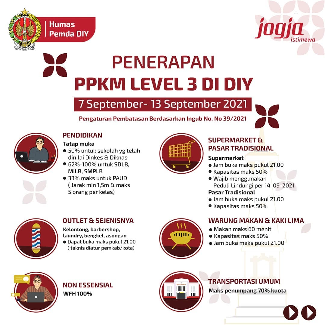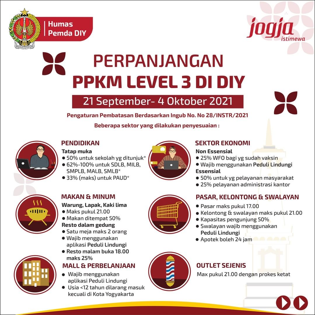 Jumat, 24 September 2021Pemerintah kembali melanjutkan kebijakan Pemberlakukan Pembatasan Kegiatan Masyarakat (PPKM) di Luar Jawa-Bali, yang berlaku tanggal 21 September hingga 4 Oktober 2021. Berikut ini peraturan lengkap PPKM Level 3 Di DIY berdasarkan Ingub No. 28/INSTR/2021. Sedulur bisa mengunduh melalui s.id/pemdadiy. Sekolah, tempat wisata dan bisokop sudah [...]