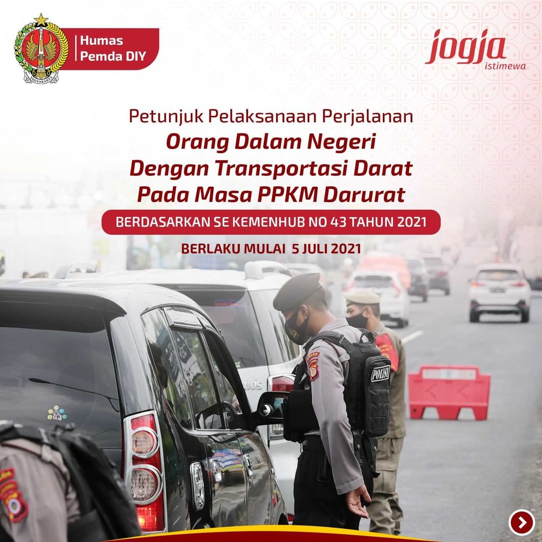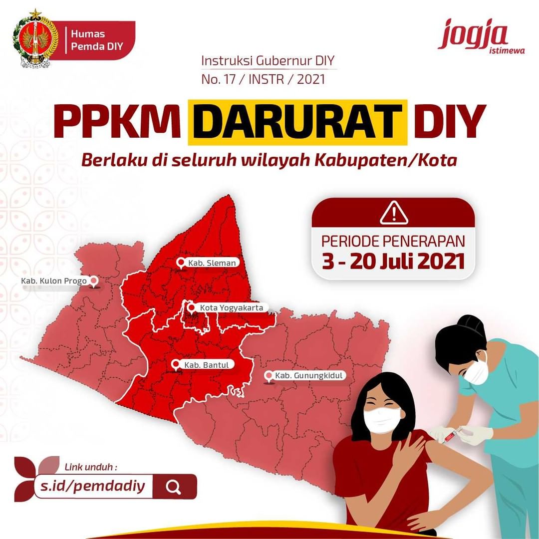 Senin, 5 Juli 2021Gubernur DIY Sri Sultan Hamengku Buwono X telah resmi mengeluarkan Instruksi Gubernur DIY No.17/INSTR/2021 tentang Pemberlakuan PPKM Darurat di Daerah Istimewa Yogyakarta. Instruksi yang berlaku mulai 3-20 Juli 2021 ini merupakan impelementasi atas Instruksi Mendagri No.15/2021 yang mengatur pemberlakuan PPKM Darurat se-Jawa Bali. Terdapat 15 [...]