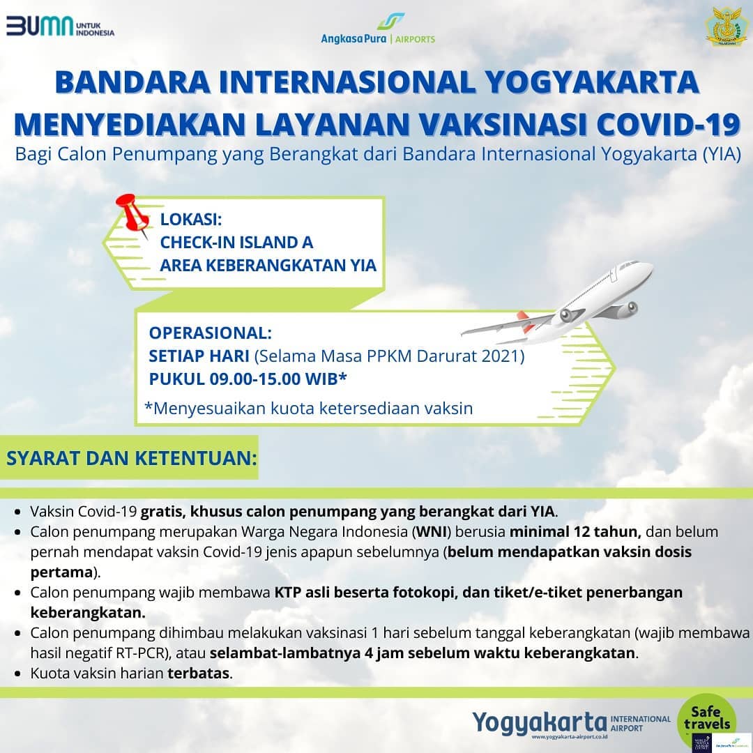 Senin, 12 Juli 2021Dalam rangka mendukung target pemerintah dalam mewujudkan 1 juta vaksin per hari pada Juli dan 2 juta vaksin per hari pada Agustus 2021, serta mendukung penerapan persyaratan protokol kesehatan pada masa PPKM Darurat, melalui Kementerian Perhubungan RI dan Kementerian Kesehatan RI, Bandara Internasional Yogyakarta menyediakan [...]