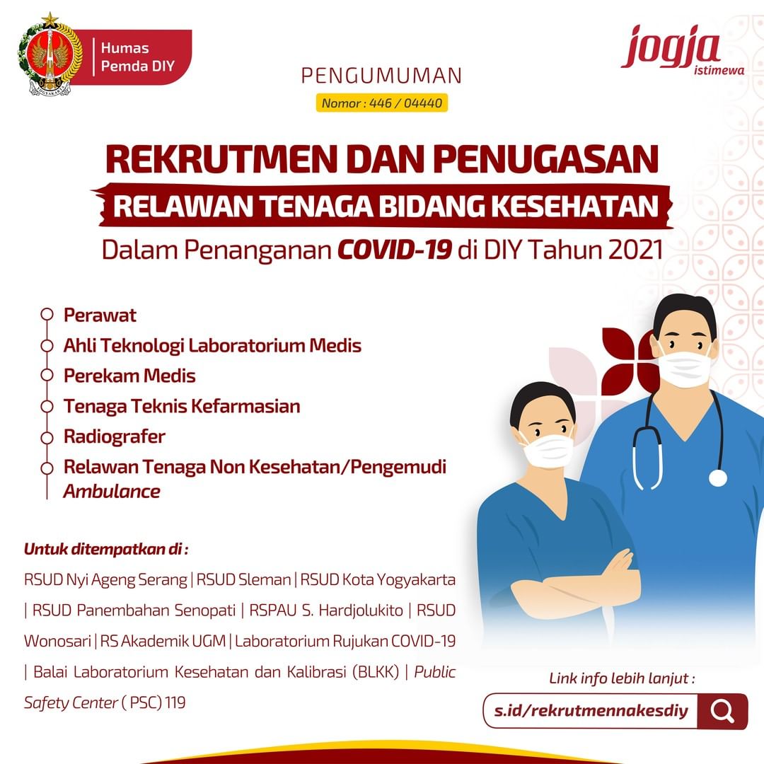 Minggu, 11 Juli 2021Rekrutmen dan Penugasan Relawan Tenaga Bidang Kesehatan Dalam Penanganan Covid-19 di DIY Tahun 2021 Dinas Kesehatan DIY melalui Poltekes Kemenkes Yogyakarta akan menyelenggarakan proses rekrutmen relawan tenaga di bidang kesehatan untuk penanganan Covid-19 Kesempatan yang dibuka adalah: 1. Perawat 2. Ahli Teknologi Laboratorium Medis 3. [...]