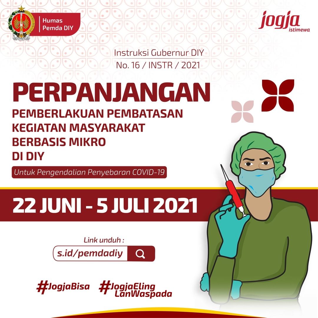 Senin, 28 Juni 2021Sesuai dengan Instruksi Gubernur DIY No. 16/INSTR/2021 beserta peta zonasi DIY. Instruksi Gubernur DIY No. 16/2021 tentang Perpanjangan Pemberlakuan Pembatasan Kegiatan Masyarakat dapat diunduh pada pranala berikut: UNDUH DISINI Sumber : https://jogjaprov.go.id/pengumuman/detail/169-instruksi-gubernur-diy-no-16-2021-tentang-perpanjangan-pemberlakuan-pembatasan-kegiatan-masyarakat