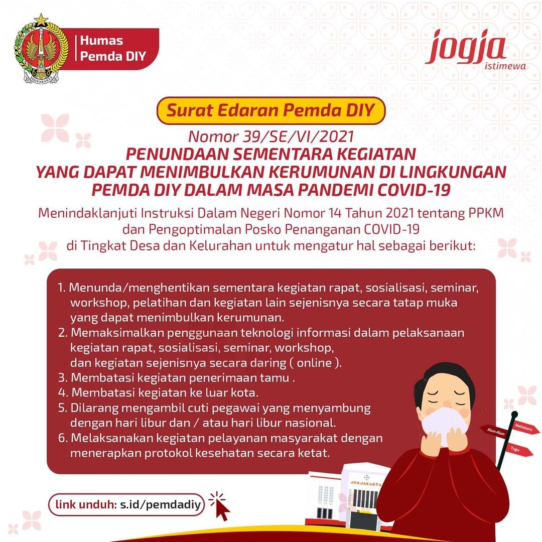 Jumat, 2 Juli 2021Surat Edaran Pemda DIY Nomor 39/SE/VI/2021 Penundaan Sementara Kegiatan yang Dapa Menimbulkan Kerumunan di Lingkungan Pemda DIY Dalam Masa Pandemi Covid-19 Menimbang kasus positif Covid-19 yang terus mengalami kenaikan, Pemda DIY mengeluarkan surat edaran untuk meminimalisir adanya kegiatan yang berpotensi menimbulkan kerumunan dan mobilitas masyarakat [...]